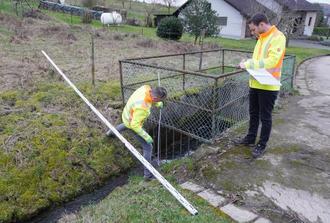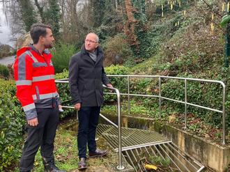 Bürgermeister Weber mit Florian Achten vom Projektmanagement Starkregenschutz an einem Einlassbauwerk, das 2018 erneuert wurde.