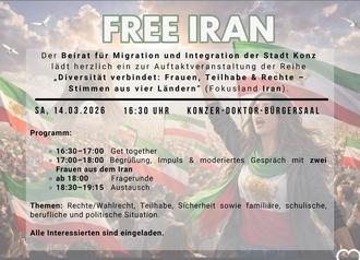 Der Beirat für Migration und Integration der Stadt Konz lädt ein zur Veranstaltungsreihe „Diversität verbindet: Frauen, Teilhabe & Rechte – Stimmen aus vier Ländern“. Bei der Auftaktveranstaltung am Samstag, 14.03.2026 ab 16:30 Uhr im Konzer-Doktor-Bürgersaal geht es um den Iran.