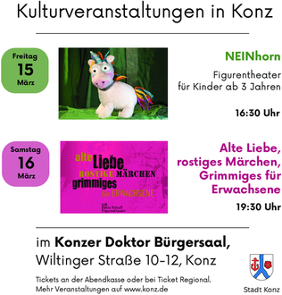 Tickets für 6€ (NEINhorn) und 15€ bzw. 12€ (Alte Liebe, rostiges Märchen) sind noch an der Abendkasse im Konzer-Doktor-Bürgersaal, Wiltinger Straße 10-12 in Konz erhältlich.