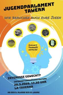 TsdJP – Tawern sucht das Jugend-Parlament: Du bist zwischen 10 und 21 Jahren alt und möchtest das Dorfleben aktiv mitgestalten? Dann komm zum ersten Infotreffen am 28. März in die Pizzaria La Taverna! Wir freuen uns auf dich und deine Ideen!