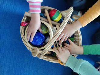 Viele bunte Tücher wurden an die Kinder verteilt. Hier aber haben einige Tücher gefehlt. Florian hat diese dann kurzerhand herbei gezaubert. So konnten die Kinder das zauberhafte Frühlingstuch doch noch präsentieren.