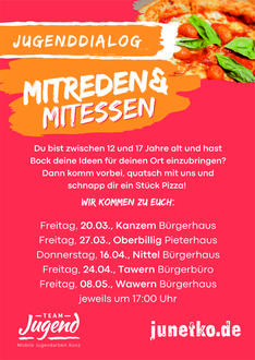 Als neues Format bietet die Mobile Jugendarbeit in der Verbandsgemeinde Konz gemeinsam mit dem Jugendforum Konz die Reihe "Jugendforum vor Ort - Jugenddialog "mitreden und mitessen" an. Unter diesem Motto startete am 20. März ein neues Format zur Jugendbeteiligung direkt vor Ort.