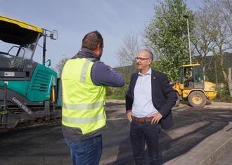 Bürgermeister Weber bei den Asphaltarbeiten an der Skateranlage in Roscheid.