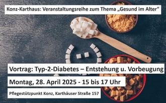 Im Rahmen der Reihe „Gesund im Alter“ wird am 28. April ein Vortrag angeboten, der über „Typ-2-Diabetes - Entstehung und Vorbeugung“ informiert.