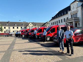 Die Freiwilligen Feuerwehren haben die neuen Fahrzeuge auf dem Marktplatz aufgestellt: (v. r.) Wehrleiter Mario Gaspar und der hauptamtliche Beigeordnete Guido Wacht mit Kommandowagen, den sechs neuen Mannschaftstransportfahrzeugen und dem neuen Mehrzweckboot.