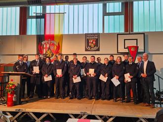 Bei herrlichem Wetter begrüßte unser Wehrführer Andreas Schmitt Samstagabend die Ehrengäste und VG-Bürgermeister und Schirmherren des 71. VG-Festes Joachim Weber. Bei seiner Ansprache ging Weber nochmals auf die Starkregen- und Hochwasser-Lage vom vorletzten Wochenende ein und dankte allen Einsatzkräften ausdrücklich für die geleistete Arbeit. Nach den Gratulationen zum 100-jährigen Jubiläum standen Neuverpflichtungen auf dem Programm. Wir freuen uns, dass Tim Trampert und Fynn Walter in den Dienst der Feuerwehr aufgenommen wurden. Im Anschluss nahm Weber die Ehrungen der Jubilare vor. Für 25 Jahre Feuerwehrdienst wurden einige Kameraden aus der VG ausgezeichnet. Im Anschluss wurden Beförderungen durchgeführt. Es wurden Luca Bälder zum Oberfeuerwehrmann und Mandy Manderscheid zur Oberfeuerwehrfrau befördert. Weiter wurden Simon Hauser zum Hauptfeuerwehrmann, sowie Felix Kraft und Gregor Kiefer zum Löschmeister befördert. Am Sonntag begrüßte die WIKA Oberemmel mit toller Musik die Besucher zum Frühschoppen. Am Nachmittag standen Fahrzeuge von THW, Rettungsdienst, Polizei, Bundeswehr und Feuerwehr zum Besichtigen bereit. Viele Interessierte bestaunten die Technik der Aussteller. Mit der Schauübung der Jugendfeuerwehren Niedermennig, Wiltingen und Oberemmel zeigten die Kids ihr Können und begeisterten die Zuschauer. Bei Kaffee und Kuchen genossen die Besucher kurzweilige Stunden bei uns. Bevor der Abend gemütlich bei einem kühlen Glas Wein oder Bier Ausklang fand, stand die Verkündigung der Gewinnspielsieger auf dem Plan. Wir bedanken uns bei allen Gästen, Besuchern, Helfern, Sponsoren und Allen, die zum Gelingen beigetragen haben.