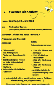 Am Sonntag, dem 30. Juni ab 11.00 Uhr findet das 2. Tawerner Bienenfest am Fischweiher – Anlage des Angelvereinsportverein Tawern 1971 e.V. (Verlängerung der Mannebacher Straße in Richtung Mannebach) statt!