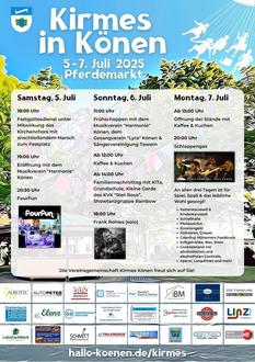Am ersten Juliwochenende vom 05. bis zum 07.07.2025 feiert Könen die Kirmes auf dem Pferdemarkt. Mit den beiden Bands „fourfun“ und „Schlappengas“ und dazu „Frank Rohles solo“ konnten gleich drei attraktive Live Acts engagiert werden.
