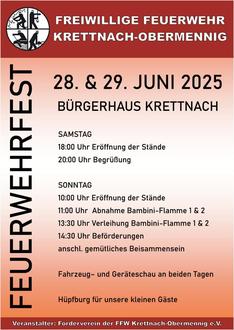 Die Freiwillige Feuerwehr Krettnach-Obermennig veranstaltet am Bürgerhaus Krettnach ihr Feuerwehrfest und lädt alle Gäste herzlich ein mitzufeiern.