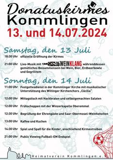 Am 13. und 14. Juli 2024 findet die diesjährige Donatuskirmes in Kommlingen statt. Die Vorbereitungen sind in vollem Gange!