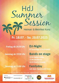 Die „HdJ Summer Session“ gibt es natürlich auch in diesem Jahr für euch auf dem Heimat- und Weinfest Konz – wir feiern ein Wochenende lang mit euch in der Stadtmitte! Los geht’s am Freitag (18.7.), um 20:30 Uhr mit der DJ Night. Mit dabei sind DJ Sovereign und PLUTOMES.