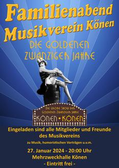 Der Musikverein Könen veranstaltet am 27.01.2024 seinen traditionellen Familienabend. Dieser findet wie gewohnt in der Turnhalle in Könen statt. Unter dem Motto „Die goldenen 20er Jahre“ wird der Musikverein Ihnen Musikwerke dieser Zeit darbieten und Sie im Anschluss mit humoristischen Vorträgen unterhalten.