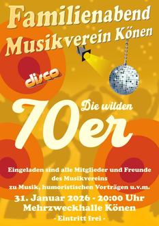 Am Samstag, den 31.01.2026, lädt der Musikverein Harmonie Könen ab 20:00 Uhr zum traditionellen Familienabend in die Mehrzweckhalle Könen ein. Unter dem diesjährigen Motto „Die wilden 70er“ dürfen sich die Besucherinnen und Besucher auf eine mitreißende Zeitreise in das Jahrzehnt von Disco, Schlaghosen und funkelnden Paillettenkleidern freuen.