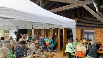 „Auch Regen ist schön, wenn man Sonne im Herzen hat“, so sagten sich viele Frauen der Frauengemeinschaft, als sie trotz gelegentlichem Nieselregen am Sonntag, den 6. Juli, den Weg zur Talbachhütte fanden, um beim Sommerfest dabei zu sein. Aber – bekanntermaßen lassen die Vorstandsfrauen „Niemanden im Regen stehen“, und so haben alle, die an diesem Nachmittag da waren, einen schönen Platz im aufgestellten Zelt oder unter der überdachten Terrasse der Grillhütte finden können.
