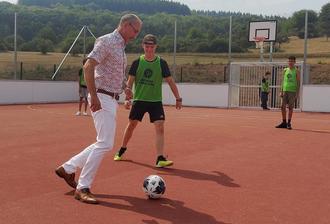 Foto: Bürgermeister Joachim Weber „kickt“ zur Einweihung des neuen Mehrzweckspielfeldes in Konz den Ball mit Schülern.