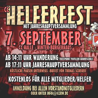 Der CC Rot-Weiss Tawern 1962 e.V. lädt alle aktiven, inaktiven Mitglieder und Helfer zum Helferfest mit der jährlichen Jahreshauptversammlung ein. Los geht’s am 7.09.2024 ab 14.11 Uhr beim Pavillon Grundschule mit einer Wanderung mit „köstlichen“ Pausen. Um 17:11 Uhr beginnt die Jahreshauptversammlung bei der CC Halle. Natürlich für alle kostenlos.