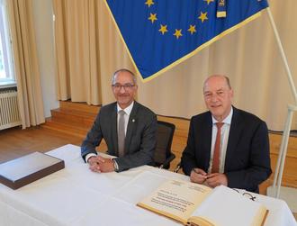 Foto: Bürgermeister Joachim Weber mit dem deutschen Botschafter in Luxemburg, Ullrich Wilhelm Klöckner, der sich bei seinem Besuch ins Goldene Buch der Stadt Konz eingetragen hat