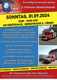 Am 01.09.2024 veranstaltet die Freiwillige Feuerwehr Könen zum 2. Mal eine Blaulichtmeile. Auf dieser Veranstaltung werden Fahrzeuge aus mehreren Blaulichteinheiten wie Feuerwehr, Rettungsdienst, Technisches Hilfswerk und der Bundeswehr ihre Fahrzeuge für die Besucherinnen und Besucher zur Schau stellen.
