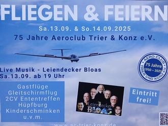 Am 13. / 14. September feiern die Mitglieder und Freunde des Segelflugsports das 75-jährige Jubiläum des Aero-Clubs. Der Verein wurde am 30.08.1950 in der „Krim“ von 52 Mitgliedern gegründet. In den ersten 25 Jahren flogen die enthusiastischen Mitglieder auf dem ehemaligen Flugplatzgelände in Trier Euren. 1976 erfolgte dann der Umzug der Segelflieger auf das heutige Gelände in Konz Könen. Die Halle und das Clubheim wurden in unzähligen Stunden an Eigenleistung errichtet, auch die Start- und Landebahnen wurden in mühseliger Sammelarbeit vom ganzen Verein „entsteint“. Der heutige Schwerpunkt liegt in der Ausbildung sowie im Spaß- und Streckenflug. Die Leiendecker Bloas werden Samstagabend für gute Stimmung sorgen – wetterunabhängig in der Flugzeughalle des Segelflugvereins. Der Eintritt ist frei.