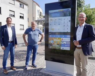 (v.l.n.r): Guido Wacht (1. Beigeordneter der VG Konz), Michael Naunheim (Digitalbeauftragter der Verwaltung) und Bürgermeister Joachim Weber an der neuen Stele am Markt