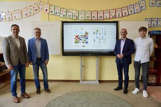 (v.l.n.r.) Guido Wacht (1. Beigeordneter der VG), Thomas Kürwitz (Schulleiter), Joachim Weber (Bürgermeister) und Philipp Hensel (Digitalbeauftragter der Schule) vor einer der digitalen Tafeln in der Grundschule St. Johann in Konz-Karthaus, die bereits seit Anfang des vergangenen Schuljahrs mit Touch Displays arbeitet.