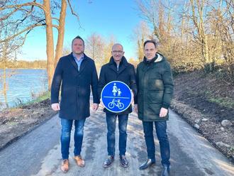 Bürgermeister Joachim Weber mit dem hauptamtlichen Beigeordneten Guido Wacht (rechts) und Tiefbauamtsleiter Kai Catrein (links) am neu asphaltierten Moselradweg in Konz-Karthaus.