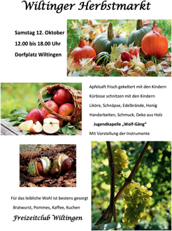 Herzliche Einladung vom Freizeitclub Wiltingen zum traditionellen Herbstmarkt auf dem Dorfplatz in Wiltingen. In gemütlicher Atmosphäre kann man am Samstag den 12. Oktober ab 12.00 Uhr Handarbeit aller Art, Schmuck, Honig, Liköre, Schnäpse und heimische Produkte erwerben. Auch frisch gepresster Apfelsaft wird wieder dabei sein. Hier dürfen die Kinder wieder kräftig mitwirken. Kürbisse können unter Aufsicht geschnitzt werden. Infostand der Winzerkapelle Wiltingen mit Darbietungen der Jugendkapelle „Wolf-Gäng“ und Vorstellung der Instrumente. Für das leibliche Wohl ist bestens gesorgt. Kühle Getränke, Bratwurst, Wildbratwurst und Pommes. Kaffee und Kuchen im Feuerwehrhaus.