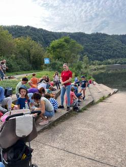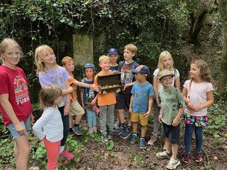 Schatz gefunden! An der Gedenktafel nahe der Staustufe konnten die Kinder auch viel Historisches erfahren.