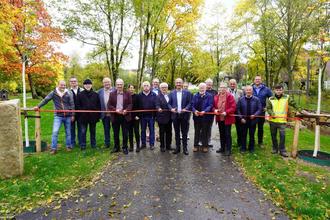 Vertreter von Stadt und Verbandsgemeinde Konz schneiden das rote Band durch und geben den Maierspark damit symbolisch für die Öffentlichkeit frei.