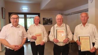 Der 1. Vorsitzende Rudolf Hauser überreichte Urkunden und goldene Nadeln im Auftrag des Chorverbandes Rheinland-Pfalz an Klaus Hoffmann für 50 Jahre, an Albert Fisch für 60 Jahre sowie an Artur Peters für 75 Jahre aktive Mitgliedschaft.