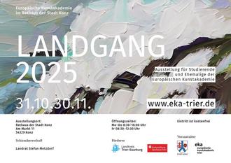 Mit der Ausstellung LANDGANG 2025 eröffnen die Europäische Kunstakademie Trier und die Stadt Konz einen neuen Raum des künstlerischen Dialogs zwischen Atelier, Landschaft und Öffentlichkeit. Vom 31. Oktober bis 30.11.2025 zeigen Studierende und Ehemalige der Akademie im Rathaus der Stadt Konz eine vielfältige Auswahl ihrer aktuellen Werke.