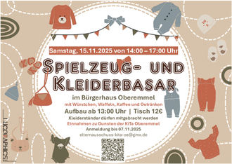 Der Elternausschuss der kath. Kita Hl. Karl Lwanga in Konz-Oberemmel veranstaltet zusammen mit dem Förderkreis der kath. Kita’s Oberemmel und Niedermennig am Samstag, 15.11.2025 von 14:00 Uhr bis 17:00 Uhr einen Kleider- und Spielzeugbasar im Bürgerhaus Oberemmel. Für das leibliche Wohl ist mit leckeren Waffeln, Würstchen und Getränken gesorgt.