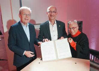 Norbert Hauser, Bürgermeister Joachim Weber und Dorothea Hölzer-Magar mit der frisch unterschriebenen Vereinbarung zwischen der Stadt Konz und der Kunststiftung