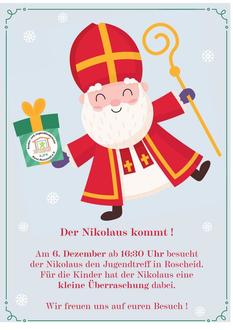 Am 6. Dezember ab 16:30 Uhr wird es weihnachtlich am Jugendtreff in Roscheid, denn der Nikolaus kommt zu Besuch! Alle Kinder dürfen sich auf eine kleine Überraschung freuen, die der Nikolaus persönlich überreicht. Neben dem besonderen Besuch sorgen wir für das leibliche Wohl: Es gibt Kinderpunsch und Glühwein zum Aufwärmen. Um Müll zu vermeiden, bitten wir alle Besucher, ihre eigene Tasse mitzubringen. Wir laden Familien herzlich ein, gemeinsam mit uns die Vorfreude auf Weihnachten zu genießen. Kommt vorbei – wir freuen uns auf Euch!