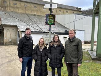 Die neue Geschwindigkeitsanzeige entschleunigt ab sofort den Verkehr in Wellen. (v. l.) Westenergie-Kommunalmanager Christian Nathem, Mitarbeiterinnen der Verbandsgemeinde Konz Maria Will und Julia Mayer sowie Ortsbürgermeister Dietmar Haag sind zufrieden.