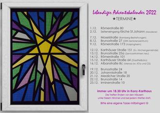 Herzliche Einladung an alle, an den aufgeführten Tagen bei der Öffnung des Fensters dabei zu sein und ein gutes Wort/einen guten Gedanken mit nach Hause zu nehmen. Treffpunkt ist immer um 18.30 Uhr am angegebenen Ort. Die Treffen finden vor den Häusern, unter freiem Himmel und bei jedem Wetter statt - bitte eine eigene Tasse mitbringen.