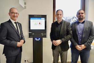Bürgermeister Joachim Weber, der 1. Beigeordnete Guido Wacht und Fachbereichsleiter Johannes Geltz beim neuen Anmeldeterminal.