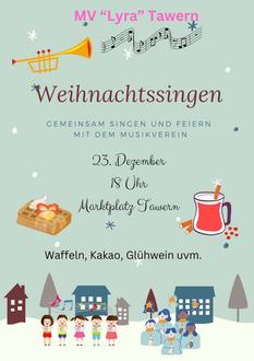 Am 23. Dezember lädt der Musikverein Lyra Tawern wieder zum gemeinsamen Singen und Feiern auf den Marktplatz in Tawern ein. Los geht es um 18 Uhr. Für das leibliche Wohl ist gesorgt. Es gibt Waffeln, Kakao und Glühwein. Der Termin für alle - groß wie klein, allein oder zusammen - zum Einstimmen auf den heiligen Abend, Leute treffen, nach dem ganzen Trubel zur Ruhe kommen und einfach einen schönen Abend haben.