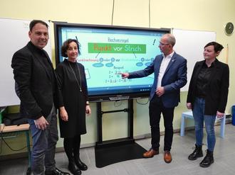 Bürgermeister Joachim Weber und der Beigeordnete der VG Konz, Guido Wacht, zu Besuch in der Grundschule Wasserliesch. Schulleiterin Adelheid Löwenbrück und die Koordinatorin für digitale Bildung, Martina Koch, präsentierten den beiden das neue Display, das als digital Tafel genutzt wird.