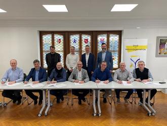 Die sechs Ortsbürgermeister aus der Verbandsgemeinde Konz mit Vertretern der VG-Verwaltung, Westconnect, Westenergie und Westnetz bei der Vertragsunterzeichnung.