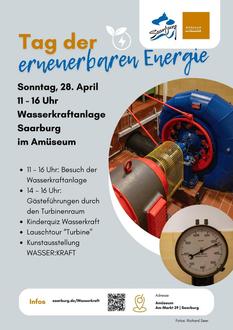 Die Stadt Saarburg ist mit dabei beim Tag der Erneuerbaren Energien, der für eine nachhaltige Energiewirtschaft steht und erneuerbare Energien erlebbar machen soll. An diesem Tag werden deutschlandweit Anlagen geöffnet und vorgestellt. Das städtische Museum Amüseum am Wasserfall beteiligt sich am Sonntag, 28. April von 11 – 16 Uhr mit der historischen Wasserkraftanlage. Das Museum bietet an diesem Tag unter anderem in der Zeit von 14-16 Uhr kostenlose, offene Gästeführungen an.