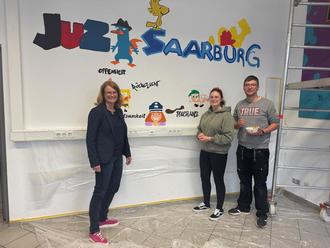Vergangene Woche trafen sich 14 Jugendliche im Jugendzentrum Saarburg, um dort gemeinsam eine Wand mit bunten Motiven und demokratischen Botschaften zu gestalten.Aufgrund der laufenden Baumaßnahme im „Offenem Treff“ des Jugendzentrums dient derzeit der ehemalige Besprechungsraum als neuer Treffpunkt für die Jugendlichen. Dieser Raum wurde im Rahmen eines Wandgestaltungsprojekts in den Osterferien durch die Jugendlichen unter der fachlichen Begleitung von Jugendzentrumsleiter Dominic Krämer, Verbandsgemeindejugendpflegerin Annika Valentin und Jugendforumsleiter Robin Schmitt bunter und ansprechender gestaltet. Der Bauhof der Verbandsgemeinde hatte dem Jungendzentrum hierzu ein Gerüst zur Verfügung gestellt.