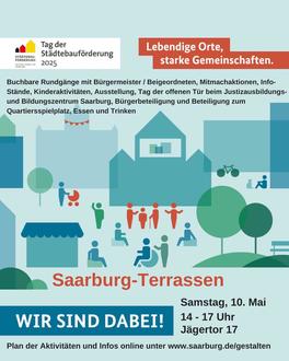 Unter dem Motto „Lebendige Orte, starke Gemeinschaften“ findet am 10. Mai bundesweit der Tag der Städtebauförderung statt. Auch Saarburg beteiligt sich an diesem Aktionstag und lädt Bürgerinnen und Bürger ein, die vielfältigen Stadtentwicklungsprojekte im neuen Stadtquartier Saarburg-Terrassen kennenzulernen und aktiv an der Gestaltung des Quartiers mitzuwirken.