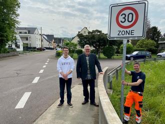 v.l.: Lukas Orth (Mitarbeiter VG Saarburg-Kell), Holger Härtel (Beigeordneter der Stadt Saarburg) und ein Mitarbeiter des städtischen Bauhofs vor einem der neuen Tempo 30-Schilder.