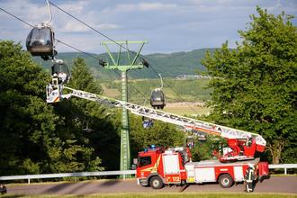 Eine Drohne lieferte währenddessen Luftaufnahmen zur besseren Übersicht über die Situation. Beobachter von Feuerwehr und Technischem Hilfswerk (THW) begleiteten die Aktion, rund 100 interessierte Zuschauer verfolgten das Geschehen. Die Passagiere in den Gondeln waren Angehörige von Feuerwehrkräften.