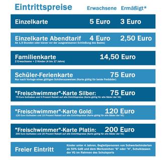 Zum Start erwartet die Besucherinnen und Besucher in Saarburg auch ein neues Tarifsystem: Neben der Einführung eines vergünstigten Abendtarifs und einer Schüler-Ferienkarte werden die bisherigen 10er und 30er Karten durch neue „Freischwimmer“-Rabattkarten ersetzt. Diese aufladbaren Karten ermöglichen bis zu 20% Ersparnis auf alle Ticketpreise (auch auf bereits ermäßigte Tickets).