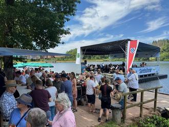 Bei strahlendem Sonnenschein und sommerlichen Temperaturen fanden sich am vergangenen Sonntag zahlreiche Gäste am Bootshaus des Stausees in Kell am See ein, um der offiziellen Eröffnung der neuen schwimmenden Seebühne beizuwohnen und das abwechslungsreiche kulturelle Rahmenprogramm direkt am Wasser zu erleben.