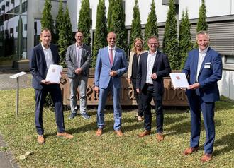 Gesundheitsminister Clemens Hoch und Landrat Stefan Metzdorf (vorne Mitte) übergaben die Förderbescheide an Verwaltungsdirektor Matthias Gehlen (links) und den stellv. Geschäftsführer Dr. Thorsten Junkermann (rechts).