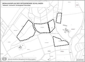 Mit der Aufstellung des Bebauungsplans sollen die bauplanungsrechtlichen Voraussetzungen für die Errichtung einer Freiflächen-Photovoltaikanlage auf derzeit landwirtschaftlich genutzten Flächen im Umfeld des Tannenhofes und des Lindenhofes rund 0,6 km nördlich der Ortslage von Schillingen geschaffen werden.