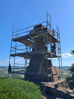 Für die Sanierung wurde das gesamte Kreuz zunächst aufwendig eingerüstet, um eine sichere Arbeitsumgebung zu gewährleisten. Im Anschluss reinigte das Team der Steinmetzwerkstatt Henning Wirtz aus Trier die Oberfläche des Sandsteins und entfernte Bewuchs sowie Schmutzablagerungen. Die vorhandenen Risse wurden fachgerecht versiegelt, alle Fugen erneuert und Stahlanker eingezogen, um den Querträger dauerhaft zu stabilisieren. Parallel dazu prüften Fachleute die Blitzschutzanlage und nahmen erforderliche Instandsetzungen vor.